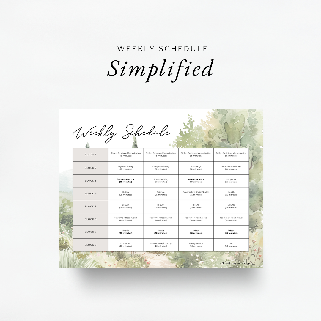 4. Simplified Approach to Learning and Teaching: No extensive prep needed, just print out your papers, gather very minimal supplies and open and go. Each day has 8 learning blocks (pssst... one block is a break and another block is the tea-time block) and you can accomplish your day's worth of homeschooling with all of your kiddos grades K-8 in about 3-4 hours each day and only 4 days a week! Every day is completely laid out for you so you don't have to even think about it, just simply open, read or instruct and you're off to the races!