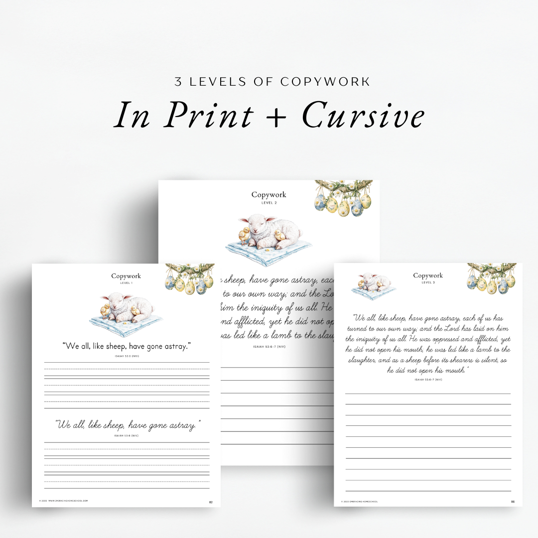 A 8-lesson enriching + eclectic family-style Easter curriculum that spreads a heartfelt feast of education, simply! Designed for grades K-8, this Charlotte Mason-inspired unit celebrates the Resurrection of Jesus through Bible lessons, art, science, and more—all in one open-and-go curriculum.