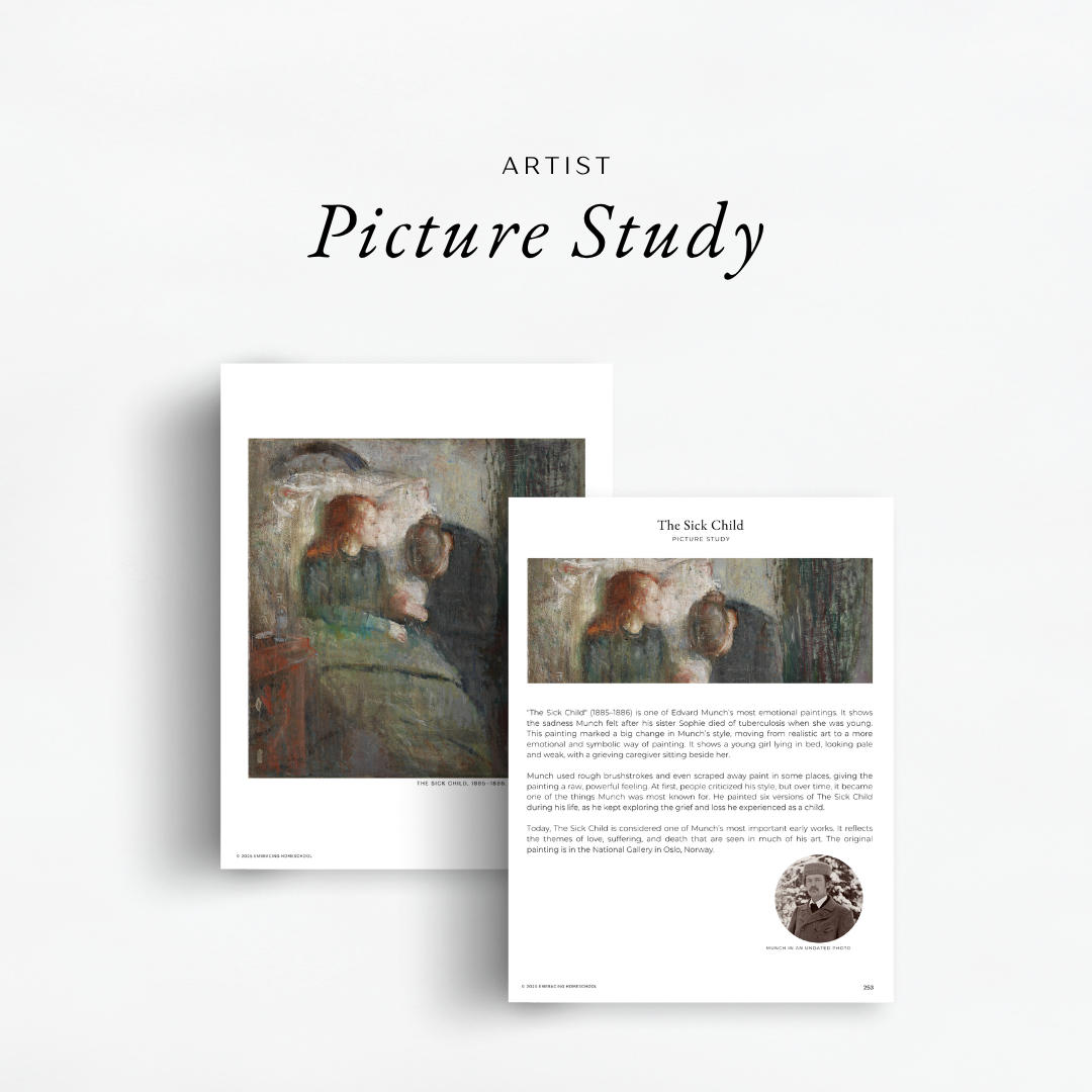 Artist + Picture Study: Famous artwork by various artists such as William Cheseldon, Edvard Munch, and Clara Peeters